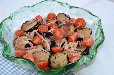 ②ナスは厚さ1㎝の輪切りにします。揚げ油を170℃前後に熱し、ナスを一分ほど素揚げし