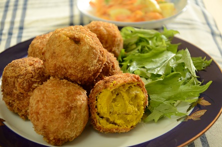 ⑥⑤を直径4㎝程度のボール状に丸め、小麦粉→溶き卵→パン粉の順に衣を付けたら、中温