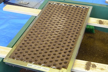 土を入れ、は種盤で穴を空けて種をまいたチェーンポット