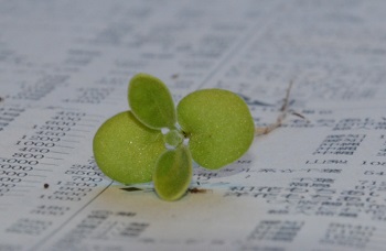 は種後約2週間で本葉2枚が展開したときに、子葉の色が濃いもの、丸いものを抜き取ります。