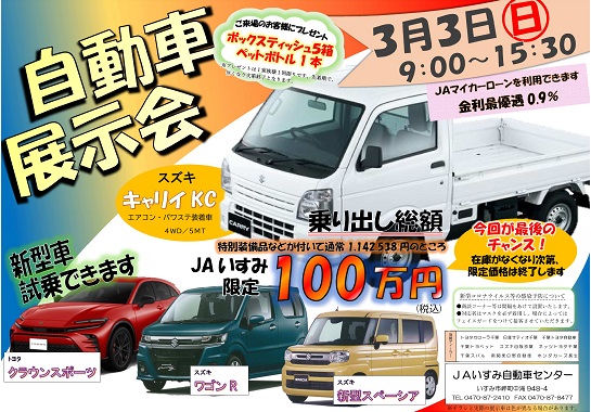 【ご来場ありがとうございました!!】3/3は自動車展示会 ※画像クリックでチラシがPDFデータで拡大表示されます。 ❁日時 3月3日(日) 9:00~15:30❁場所 JAいすみ自動車センター (いすみ市岬町中滝948-4) 人気・話題の自動車をずらりと展示し、販売します。車種によっては試乗ができます。お買い得車もご用意!お気軽にご来場ください。 お買い得車 スズキキャリイKC 乗り出し総額100万円(在庫がなくなり次第終了 お早めに!) 【お問い合わせ】JAいすみ自動車センター(☎0470-87-2410)